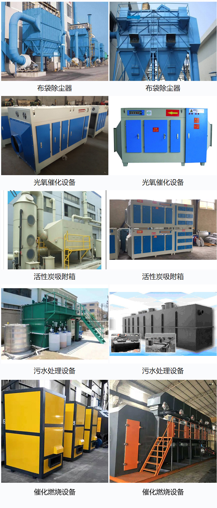 污水處理設(shè)備(地埋式污水處理設(shè)備、一體化污水處理設(shè)備)、廢氣治理設(shè)備(旋風(fēng)除塵器、布袋除塵器、濾筒除塵器)、有機廢氣處理設(shè)備(活性炭環(huán)保吸附、UV光氧催化設(shè)備、催化燃燒設(shè)備)